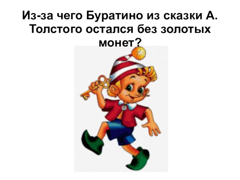 Слайд 10 Из-за чего Буратино из сказки А.Толстого остался без золотых монет?