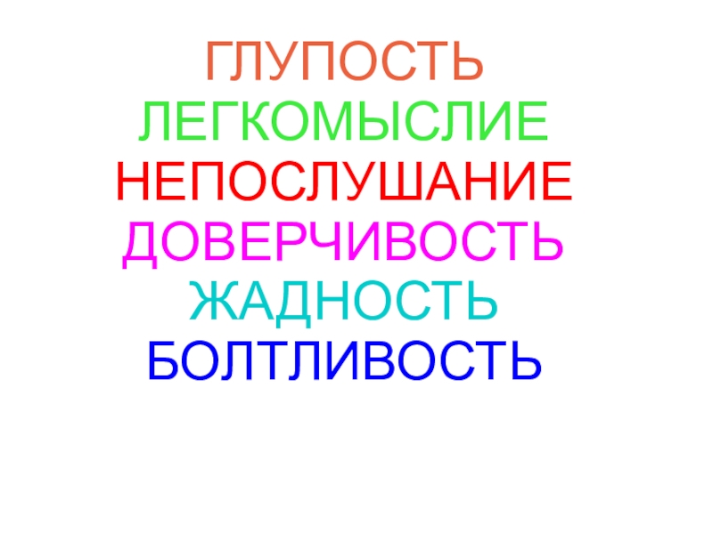 ГЛУПОСТЬЛЕГКОМЫСЛИЕНЕПОСЛУШАНИЕДОВЕРЧИВОСТЬЖАДНОСТЬБОЛТЛИВОСТЬ