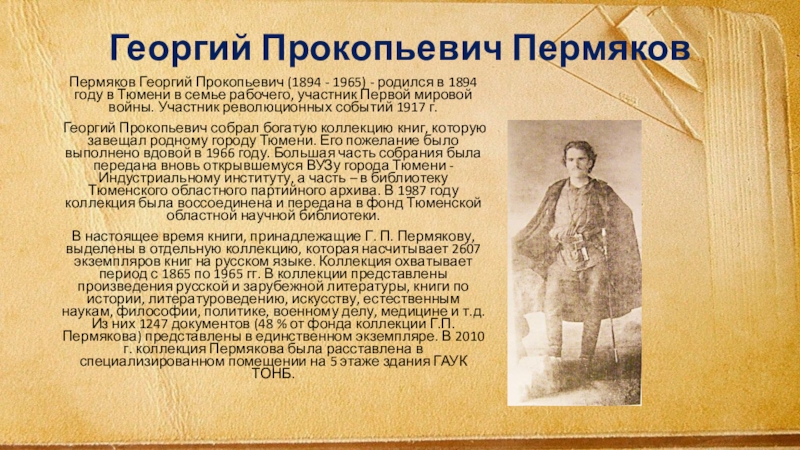 В настоящее время книги, принадлежащие Г. П. Пермякову, выделены в отдельную коллекцию, которая насчитывает 2607 экземпляров книг на русском языке. Коллекция охватывает период с 1865 по 1965 гг. В коллекции представлены произведения русской и зарубежной литературы, книги по истории, литературоведению, искусству, естественным наукам, философии, политике, военному делу, медицине и т.д. Из них 1247 документов (48 % от фонда коллекции Г.П. Пермякова) представлены в единственном экземпляре. В 2010 г. коллекция Пермякова была расставлена в специализированном помещении на 5 этаже здания ГАУК ТОНБ.