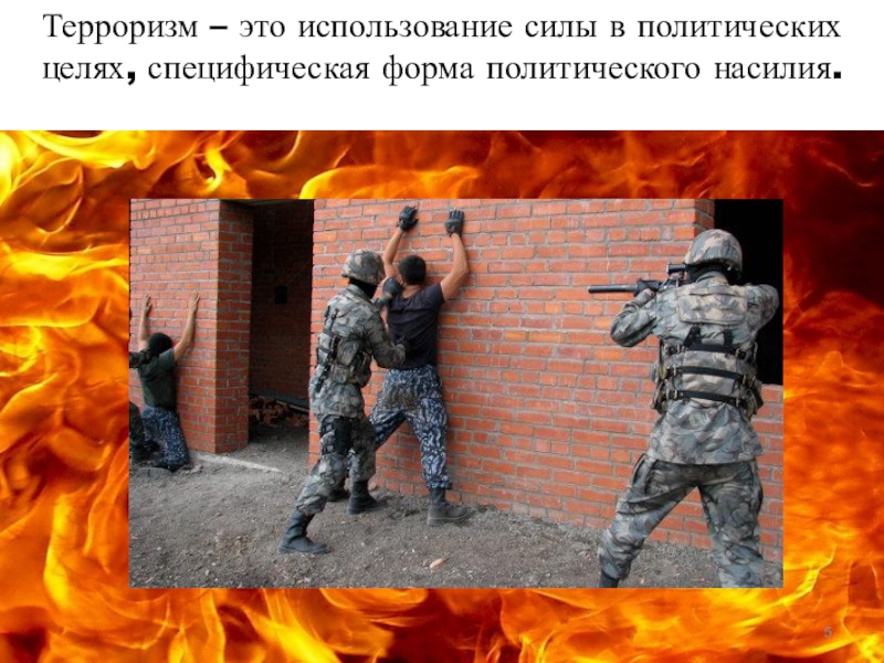 Слайд 5Терроризм – это использование силы в политических целях, специфическая форма политического