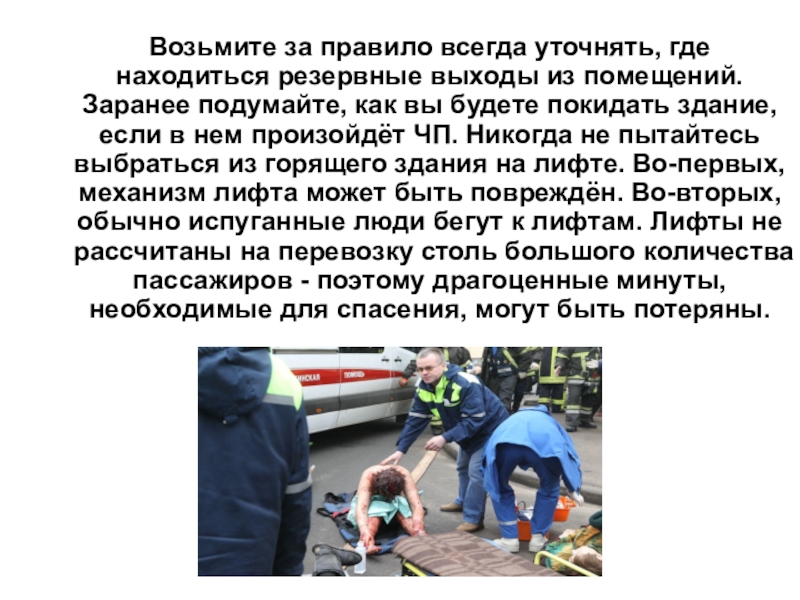 Заранее подумайте, как вы будете покидать здание, если в нем произойдёт ЧП. Никогда не пытайтесь выбраться из горящего здания на лифте. Во-первых, механизм лифта может быть повреждён. Во-вторых, обычно испуганные люди бегут к лифтам. Лифты не рассчитаны на перевозку столь большого количества пассажиров - поэтому драгоценные минуты, необходимые для спасения, могут быть потеряны.