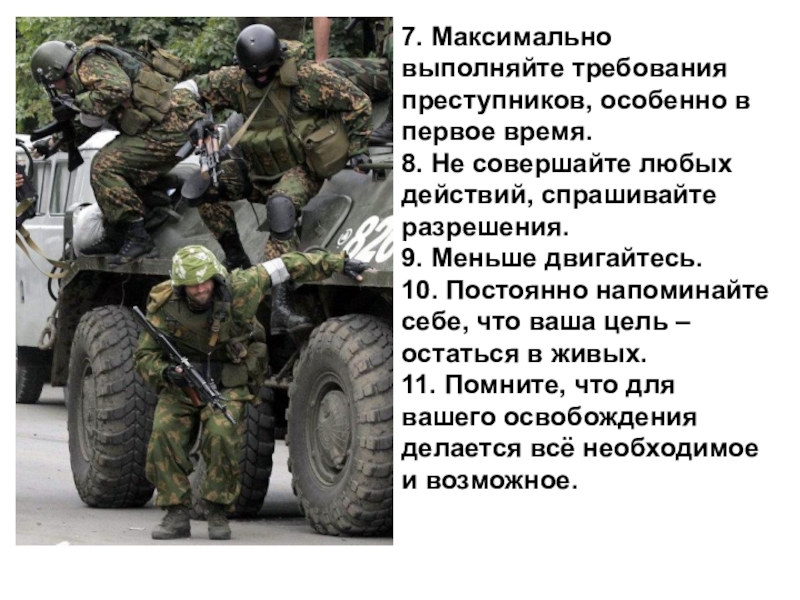 Слайд 157. Максимально выполняйте требования преступников, особенно в первое время.