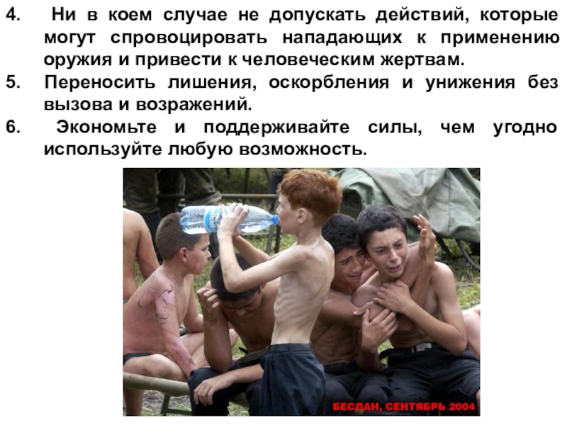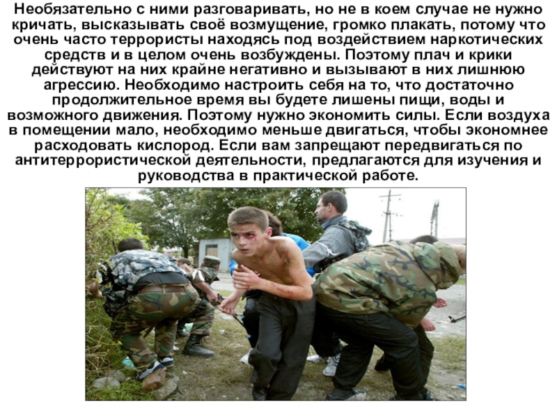 кричать, высказывать своё возмущение, громко плакать, потому что очень часто террористы находясь под воздействием наркотических средств и в целом очень возбуждены. Поэтому плач и крики действуют на них крайне негативно и вызывают в них лишнюю агрессию. Необходимо настроить себя на то, что достаточно продолжительное время вы будете лишены пищи, воды и возможного движения. Поэтому нужно экономить силы. Если воздуха в помещении мало, необходимо меньше двигаться, чтобы экономнее расходовать кислород. Если вам запрещают передвигаться по антитеррористической деятельности, предлагаются для изучения и руководства в практической работе.