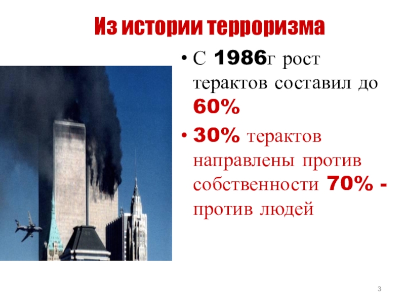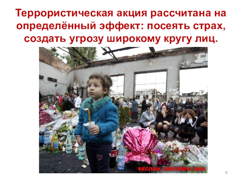 Слайд 6Террористическая акция рассчитана на определённый эффект: посеять страх, создать угрозу широкому