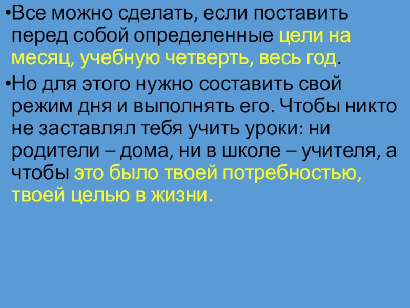 Но для этого нужно составить свой режим дня и выполнять его. Чтобы никто не заставлял тебя учить уроки: ни родители – дома, ни в школе – учителя, а чтобы это было твоей потребностью, твоей целью в жизни.