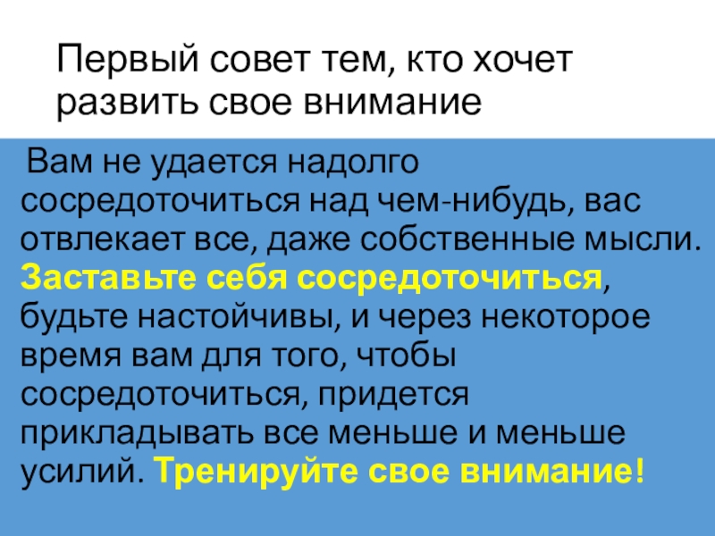 Слайд 9Первый совет тем, кто хочет развить свое внимание