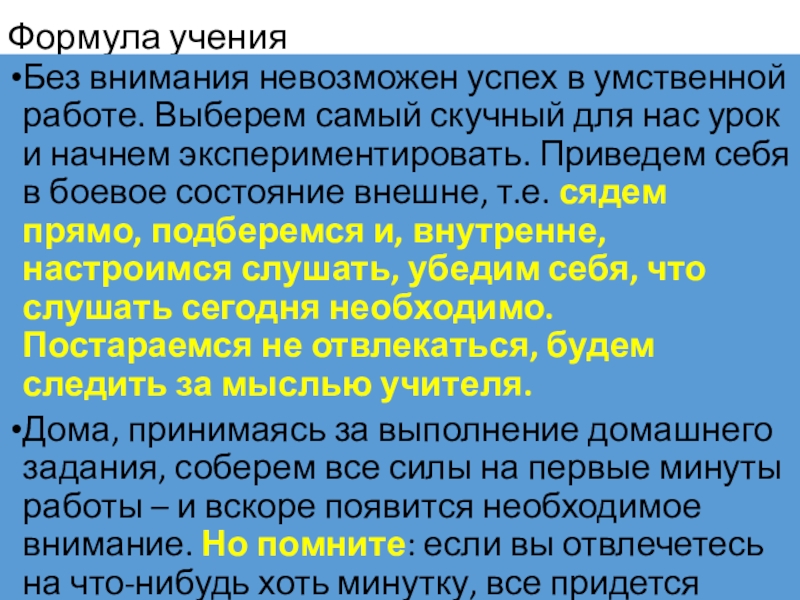 Дома, принимаясь за выполнение домашнего задания, соберем все силы на первые минуты работы – и вскоре появится необходимое внимание. Но помните: если вы отвлечетесь на что-нибудь хоть минутку, все придется начинать сначала.