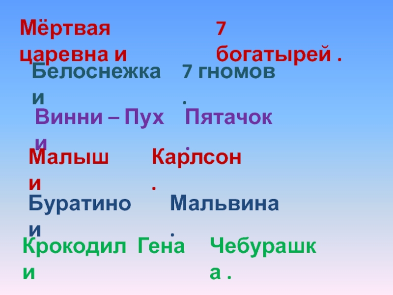 Мёртвая царевна и7 богатырей .Белоснежка и7 гномов .Винни – Пух и Пятачок .Малыш  и Карлсон .Буратино
