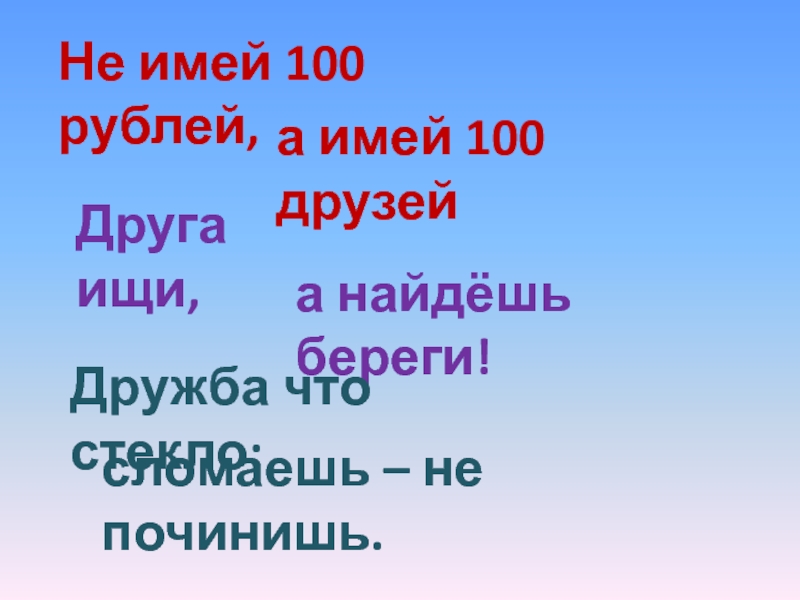 Не имей 100 рублей,а имей 100 друзейДруга ищи,а найдёшь береги!Дружба что стекло:сломаешь – не починишь.