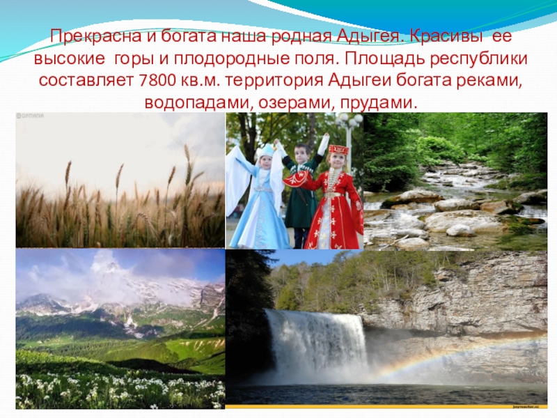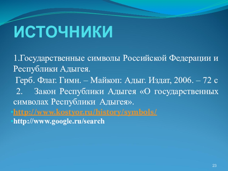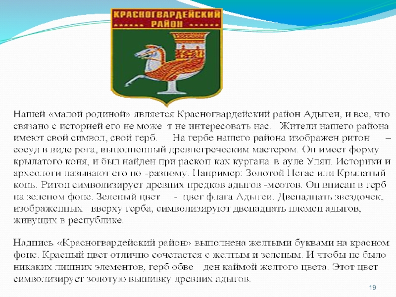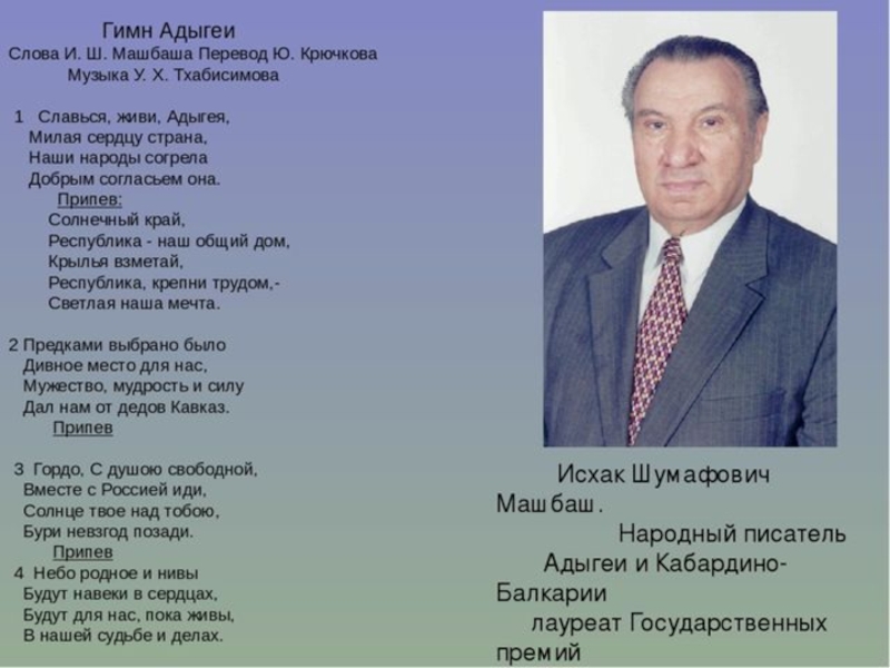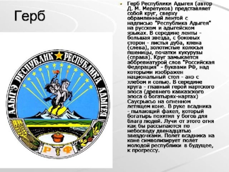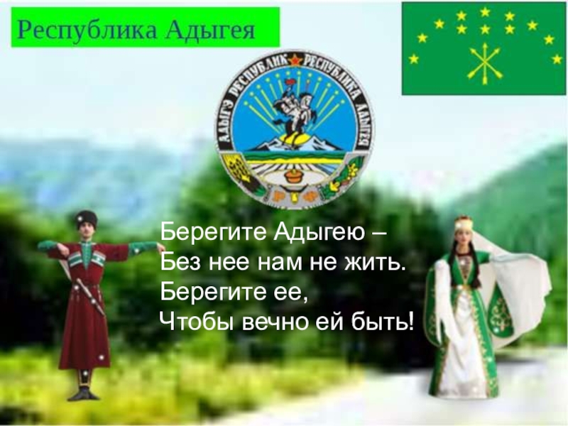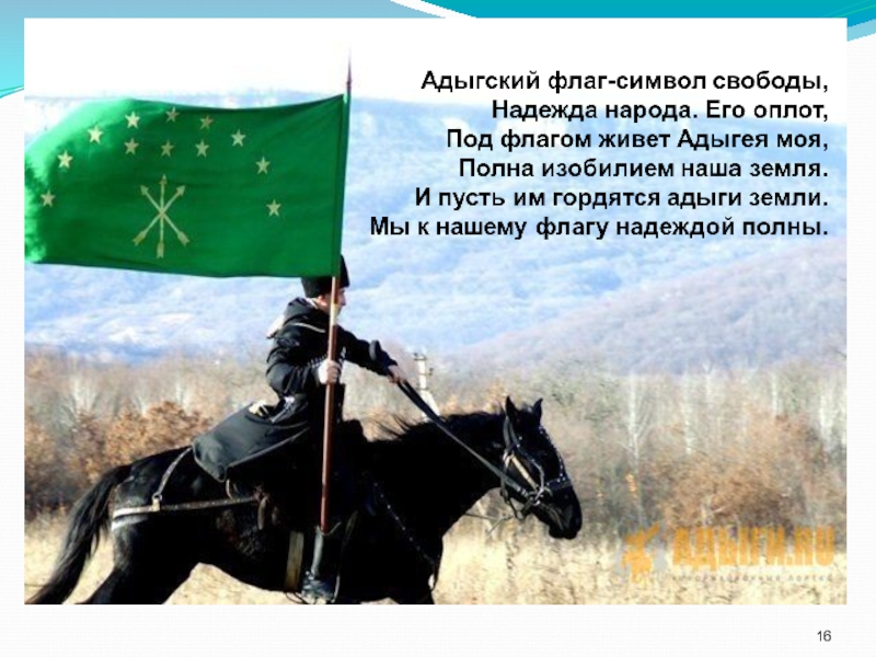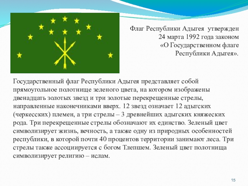 Государственный флаг Республики Адыгея представляет собой прямоугольное полотнище зеленого цвета, на котором изображены двенадцать золотых звезд и три золотые перекрещенные стрелы, направленные наконечниками вверх. 12 звезд означает 12 адыгских (черкесских) племен, а три стрелы – 3 древнейших адыгских княжеских рода. Три перекрещенные стрелы обозначают их единство. Зеленый цвет символизирует жизнь, вечность, а также одну из природных особенностей республики, в которой почти 40 процентов территории занимают леса. Три стрелы также ассоциируется с богом Тлепшем. Зеленый цвет полотнища символизирует религию – ислам.