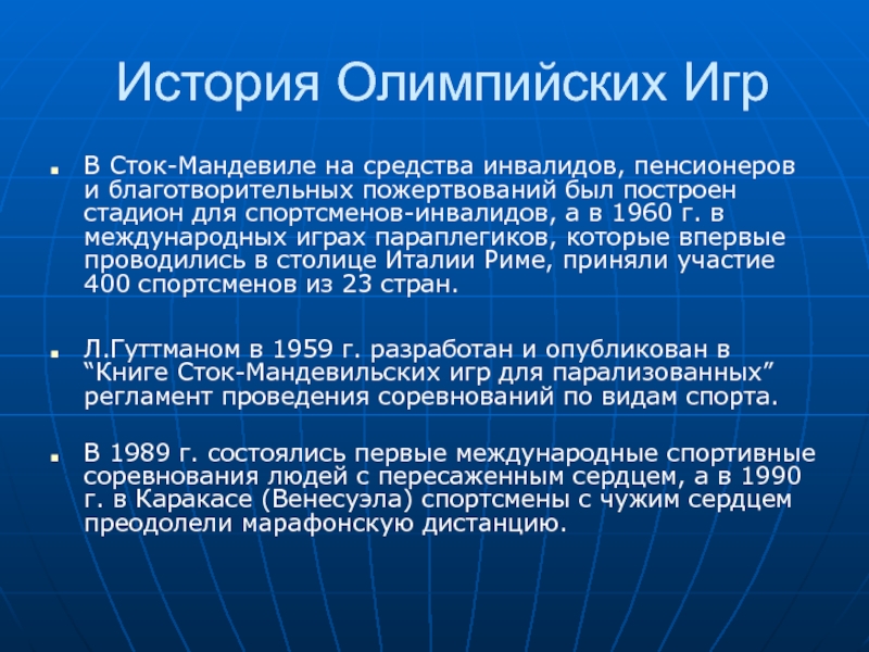 Л.Гуттманом в 1959 г. разработан и опубликован в “Книге Сток-Мандевильских игр для парализованных” регламент проведения соревнований по видам спорта.