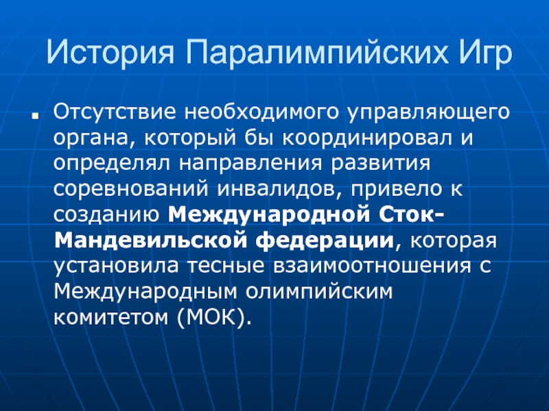 направления развития соревнований инвалидов, привело к созданию Международной Сток-Мандевильской федерации, которая установила тесные взаимоотношения с Международным олимпийским комитетом (МОК).