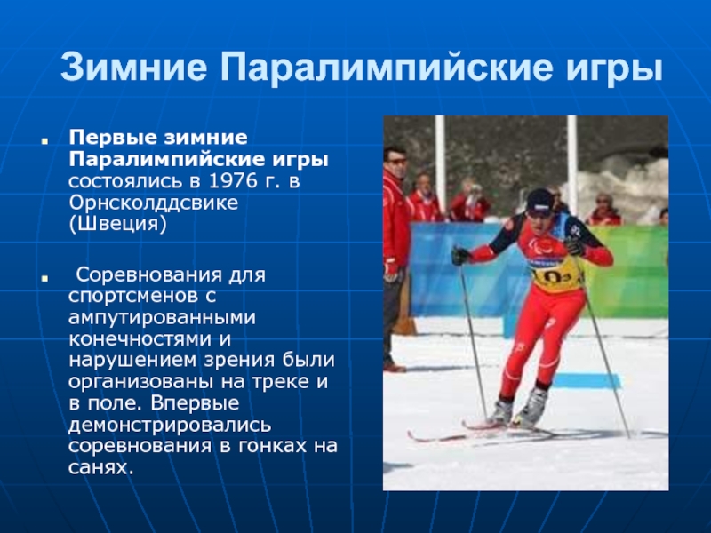 Первые зимние Паралимпийские игры состоялись в 1976 г. в