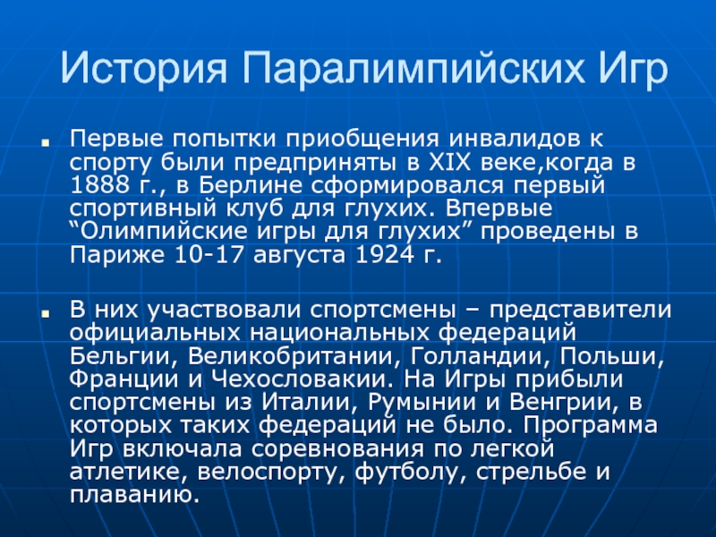 XIX веке,когда в 1888 г., в Берлине сформировался первый спортивный клуб для глухих. Впервые “Олимпийские игры для глухих” проведены в Париже 10-17 августа 1924 г.