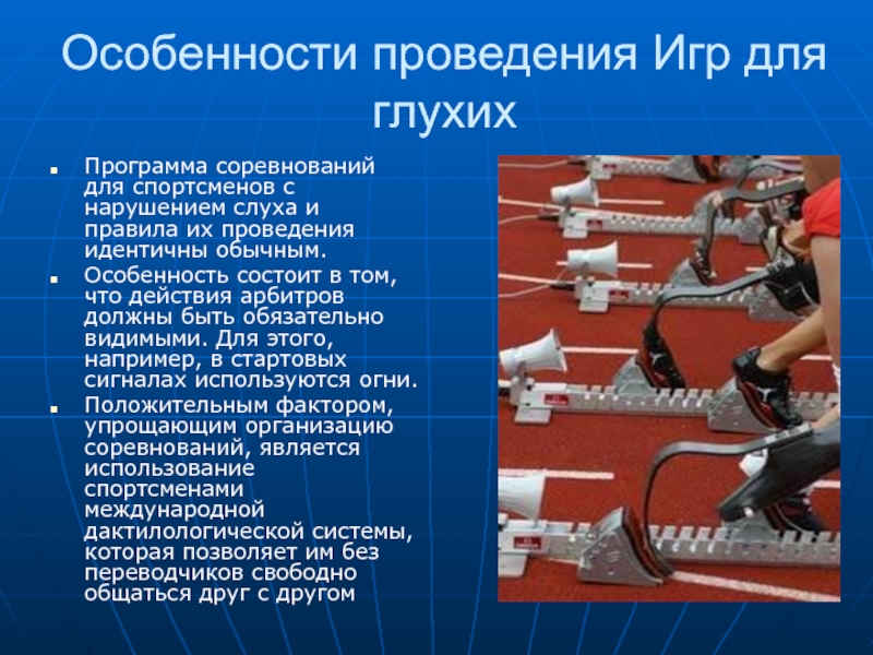 Положительным фактором, упрощающим организацию соревнований, является использование спортсменами международной дактилологической системы, которая позволяет им без переводчиков свободно общаться друг с другом