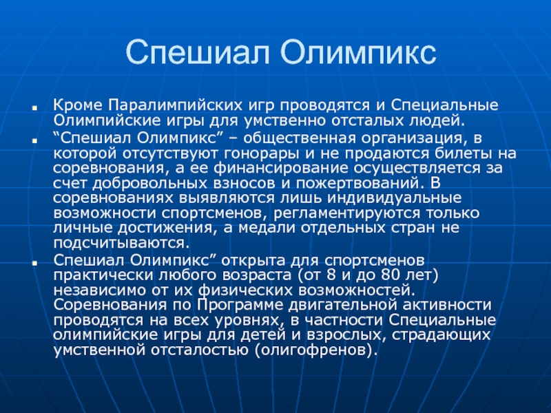 Кроме Паралимпийских игр проводятся и Специальные Олимпийские игры для умственно