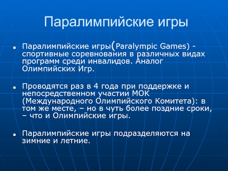 Паралимпийские игры(Paralympic Games) -спортивные соревнования в различных видах программ среди