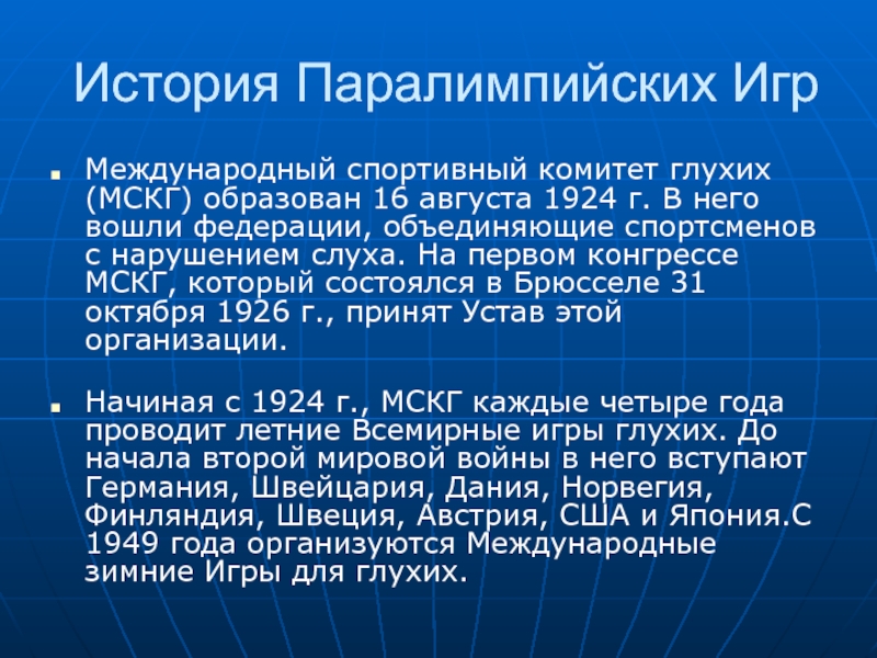 г. В него вошли федерации, объединяющие спортсменов с нарушением слуха. На первом конгрессе МСКГ, который состоялся в Брюсселе 31 октября 1926 г., принят Устав этой организации.