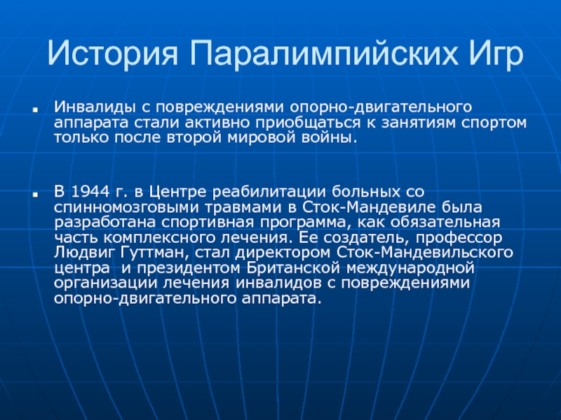 В 1944 г. в Центре реабилитации больных со спинномозговыми травмами в Сток-Мандевиле была разработана спортивная программа, как обязательная часть комплексного лечения. Ее создатель, профессор Людвиг Гуттман, стал директором Сток-Мандевильского центра и президентом Британской международной организации лечения инвалидов с повреждениями опорно-двигательного аппарата.