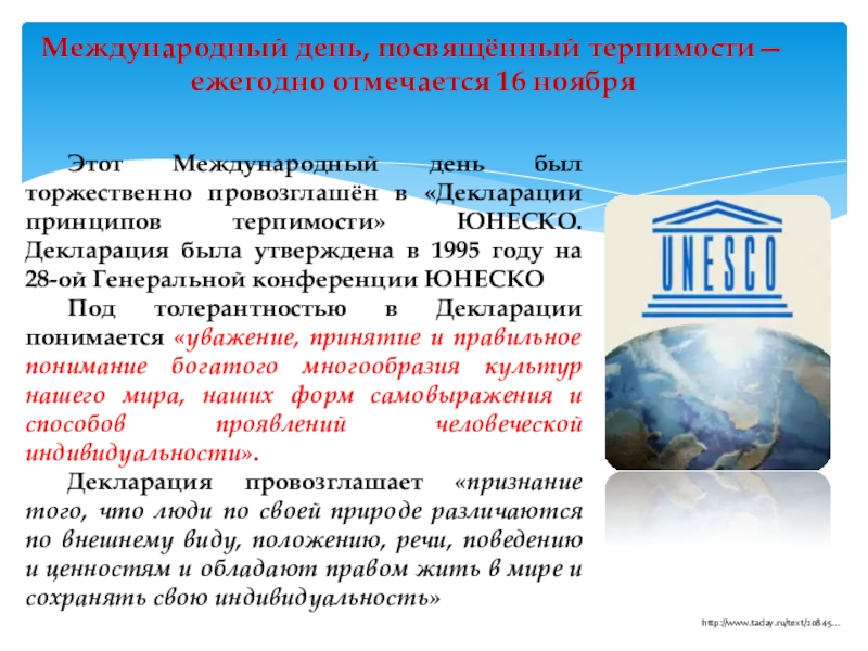 Международный день, посвящённый терпимости— ежегодно отмечается 16 ноября