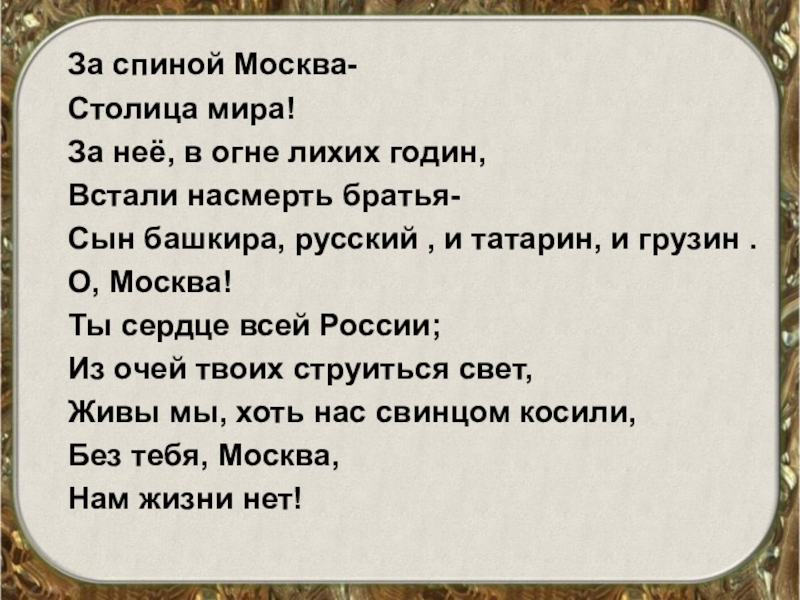 За спиной Москва-Столица мира!За неё, в огне лихих годин,Встали насмерть братья- Сын башкира, русский , и татарин,