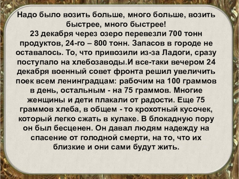 через озеро перевезли 700 тонн продуктов, 24-го – 800 тонн. Запасов в городе не оставалось. То, что привозили из-за Ладоги, сразу поступало на хлебозаводы.И все-таки вечером 24 декабря военный совет фронта решил увеличить поек всем ленинградцам: рабочим на 100 граммов в день, остальным - на 75 граммов. Многие женщины и дети плакали от радости. Еще 75 граммов хлеба, в общем - то крохотный кусочек, который легко сжать в кулаке. В блокадную пору он был бесценен. Он давал людям надежду на спасение от голодной смерти, на то, что их близкие и они сами будут жить.