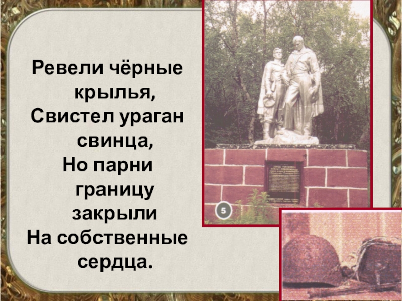 Ревели чёрные крылья,Свистел ураган свинца,Но парни границу закрылиНа собственные сердца.
