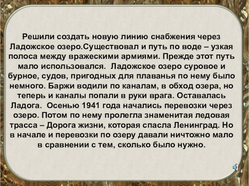 Решили создать новую линию снабжения через Ладожское озеро.Существовал и путь по воде – узкая полоса между вражескими