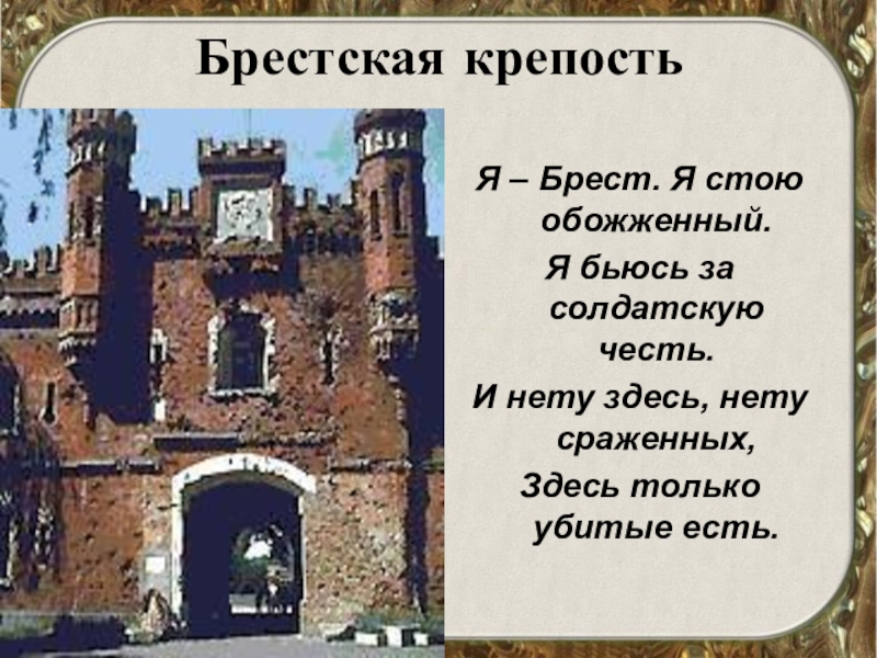 Брестская крепостьЯ – Брест. Я стою обожженный. Я бьюсь за солдатскую честь.И нету здесь, нету сраженных,Здесь только