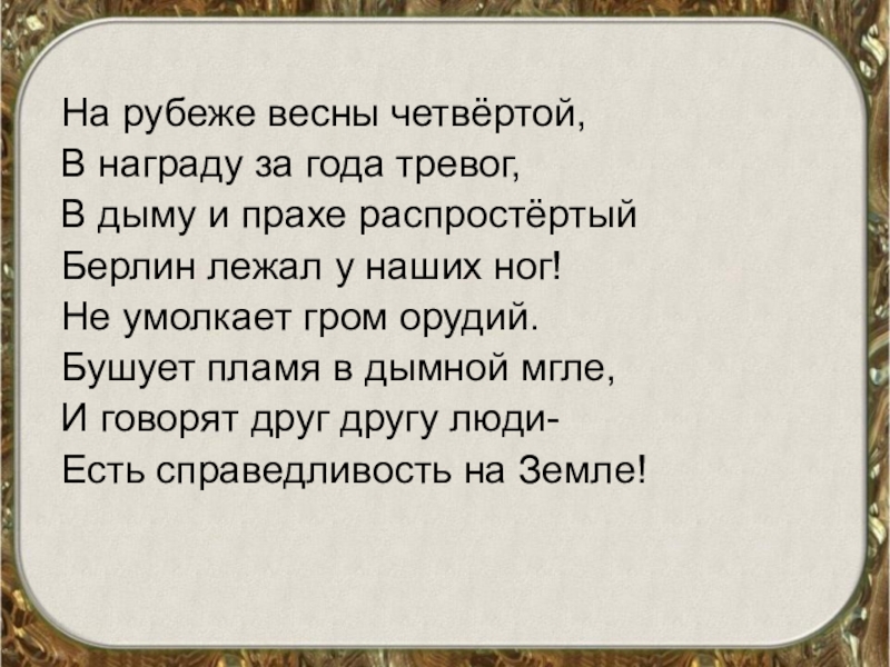 На рубеже весны четвёртой,В награду за года тревог,В дыму и прахе распростёртыйБерлин лежал у наших ног! Не