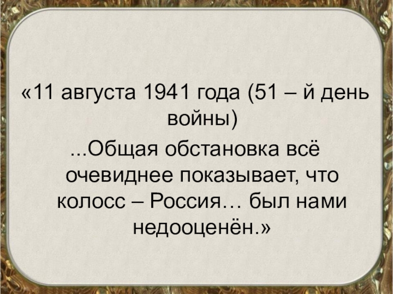 «11 августа 1941 года (51 – й день войны)...Общая обстановка всё очевиднее показывает, что колосс – Россия…