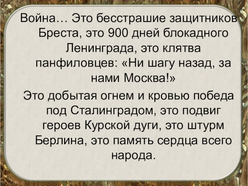 Война… Это бесстрашие защитников Бреста, это 900 дней блокадного Ленинграда, это клятва панфиловцев: «Ни шагу назад, за
