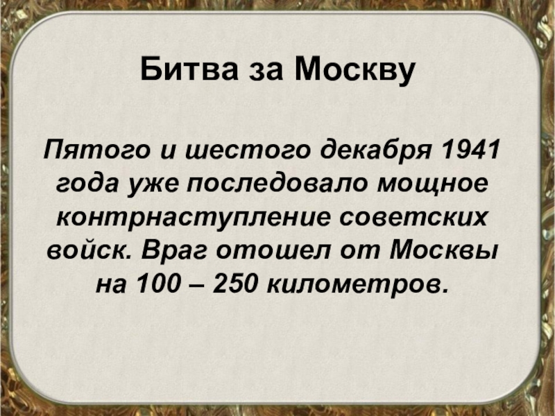контрнаступление советских войск. Враг отошел от Москвы на 100 – 250 километров.