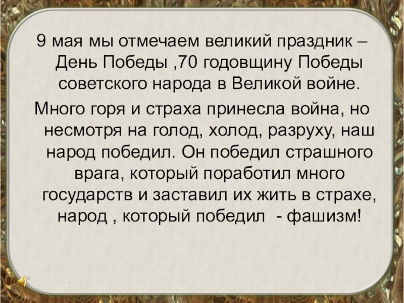Много горя и страха принесла война, но несмотря на голод, холод, разруху, наш народ победил. Он победил страшного врага, который поработил много государств и заставил их жить в страхе, народ , который победил - фашизм!