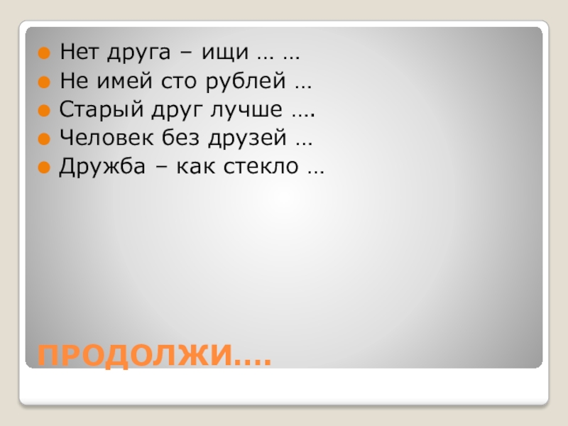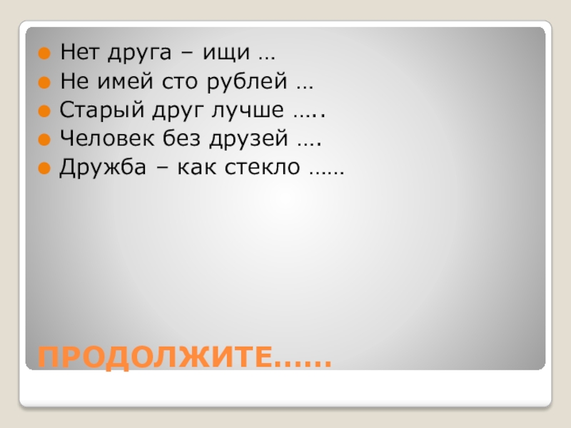 ПРОДОЛЖИТЕ……Нет друга – ищи … Не имей сто рублей …Старый друг лучше …..Человек без друзей ….Дружба –