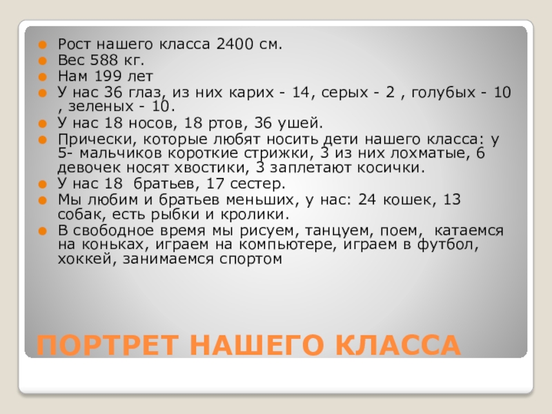 ПОРТРЕТ НАШЕГО КЛАССАРост нашего класса 2400 см.Вес 588 кг.Нам 199 летУ нас 36 глаз, из них карих - 14, серых - 2 , голубых - 10 , зеленых - 10.У нас 18 носов, 18 ртов, 36
