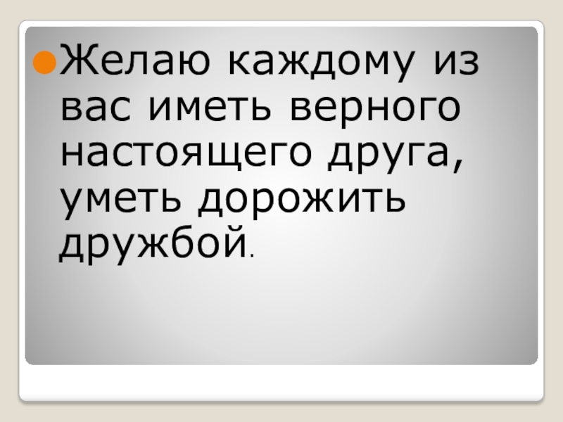 Слайд 10Желаю каждому из вас иметь верного настоящего друга, уметь дорожить дружбой.