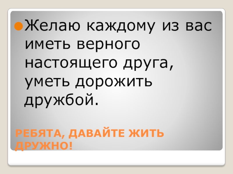 РЕБЯТА, ДАВАЙТЕ ЖИТЬ ДРУЖНО!Желаю каждому из вас иметь верного настоящего друга, уметь дорожить дружбой.