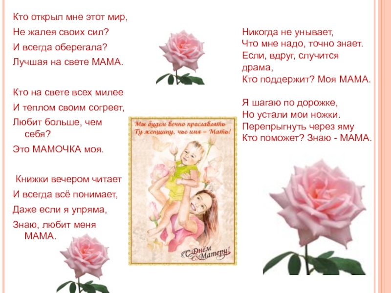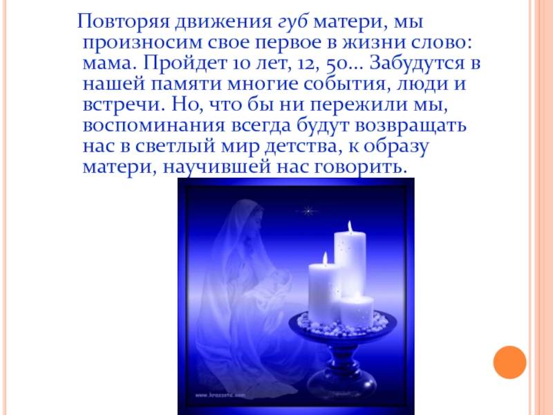 слово: мама. Пройдет 10 лет, 12, 50... Забудутся в нашей памяти многие события, люди и встречи. Но, что бы ни пережили мы, воспоминания всегда будут возвращать нас в светлый мир детства, к образу матери, научившей нас говорить.