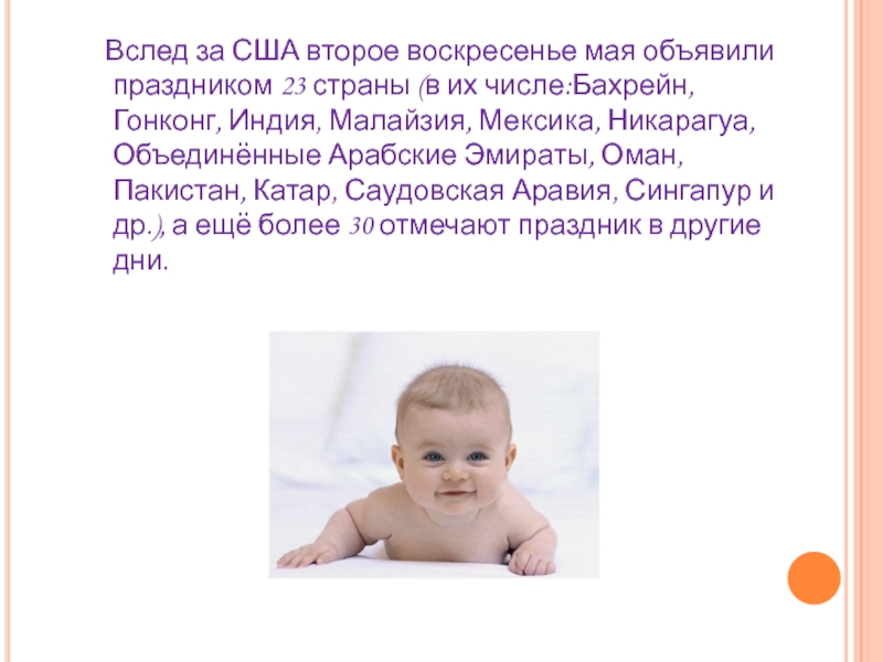 Слайд 11 Вслед за США второе воскресенье мая объявили праздником 23