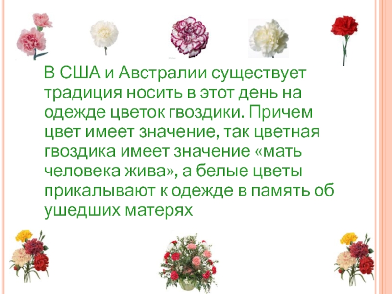 день на одежде цветок гвоздики. Причем цвет имеет значение, так цветная гвоздика имеет значение «мать человека жива», а белые цветы прикалывают к одежде в память об ушедших матерях