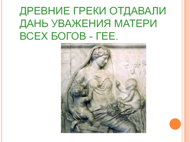 Слайд 5ДРЕВНИЕ ГРЕКИ ОТДАВАЛИ ДАНЬ УВАЖЕНИЯ МАТЕРИ ВСЕХ БОГОВ - ГЕЕ.