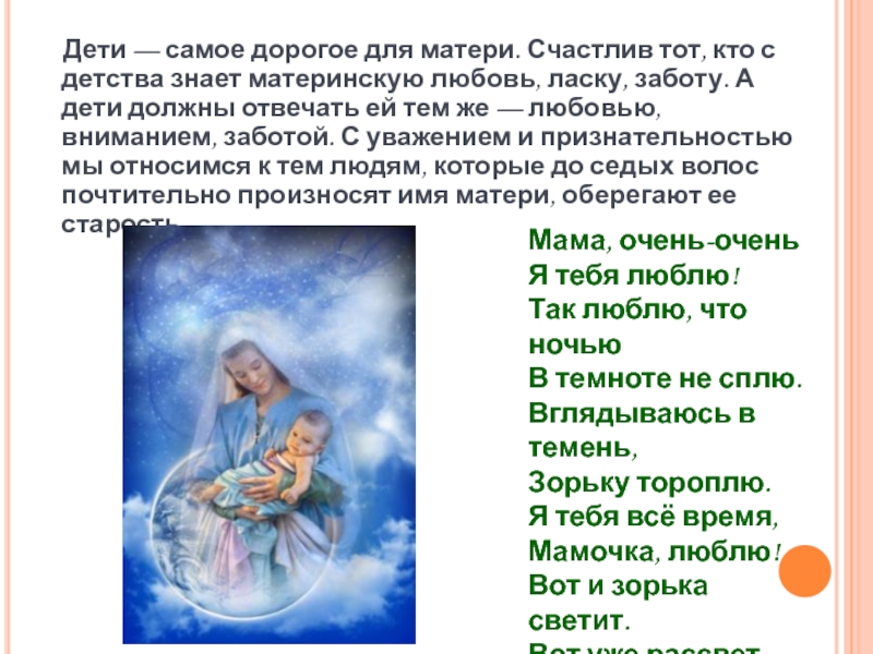 с детства знает материнскую любовь, ласку, заботу. А дети должны отвечать ей тем же — любовью, вниманием, заботой. С уважением и признательностью мы относимся к тем людям, которые до седых волос почтительно произносят имя матери, оберегают ее старость