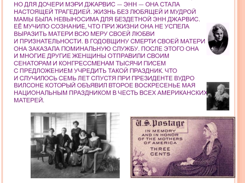 ВИРДЖИНИЯ. 7 МАЯ 1906 ГОДА В ГОРОДЕ ФИЛАДЕЛЬФИЯ СКОНЧАЛАСЬ МЭРИ ДЖАРВИС. СМЕРТЬ СЕЙ ПОЧТЕННОЙ И НАБОЖНОЙ ЖЕНЩИНЫ ОПЛАКИВАЛИ БРАТЬЯ И СЁСТРЫ ПО МЕТОДИСТСКОЙ ОБЩИНЕ, НО ДЛЯ ДОЧЕРИ МЭРИ ДЖАРВИС — ЭНН — ОНА СТАЛА НАСТОЯЩЕЙ ТРАГЕДИЕЙ. ЖИЗНЬ БЕЗ ЛЮБЯЩЕЙ И МУДРОЙ МАМЫ БЫЛА НЕВЫНОСИМА ДЛЯ БЕЗДЕТНОЙ ЭНН ДЖАРВИС. ЕЁ МУЧИЛО СОЗНАНИЕ, ЧТО ПРИ ЖИЗНИ ОНА НЕ УСПЕЛА ВЫРАЗИТЬ МАТЕРИ ВСЮ МЕРУ СВОЕЙ ЛЮБВИ И ПРИЗНАТЕЛЬНОСТИ. В ГОДОВЩИНУ СМЕРТИ СВОЕЙ МАТЕРИ ОНА ЗАКАЗАЛА ПОМИНАЛЬНУЮ СЛУЖБУ. ПОСЛЕ ЭТОГО ОНА И МНОГИЕ ДРУГИЕ ЖЕНЩИНЫ ОТПРАВИЛИ СВОИМ СЕНАТОРАМ И КОНГРЕССМЕНАМ ТЫСЯЧИ ПИСЕМ С ПРЕДЛОЖЕНИЕМ УЧРЕДИТЬ ТАКОЙ ПРАЗДНИК. ЧТО И СЛУЧИЛОСЬ СЕМЬ ЛЕТ СПУСТЯ ПРИ ПРЕЗИДЕНТЕ ВУДРО ВИЛСОНЕ КОТОРЫЙ ОБЪЯВИЛ ВТОРОЕ ВОСКРЕСЕНЬЕ МАЯ НАЦИОНАЛЬНЫМ ПРАЗДНИКОМ В ЧЕСТЬ ВСЕХ АМЕРИКАНСКИХ МАТЕРЕЙ.