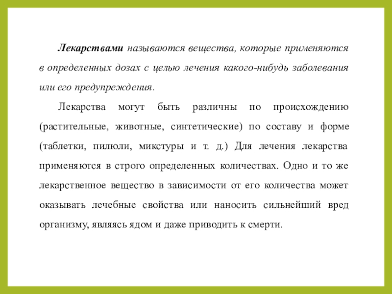 Лекарства могут быть различны по происхождению (растительные, животные, синтетические) по составу и форме (таблетки, пилюли, микстуры и т. д.) Для лечения лекарства применяются в строго определенных количествах. Одно и то же лекарственное вещество в зависимости от его количества может оказывать лечебные свойства или наносить сильнейший вред организму, являясь ядом и даже приводить к смерти.