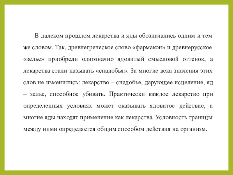 словом. Так, древнегреческое слово «фармакон» и древнерусское «зелье» приобрели однозначно ядовитый смысловой оттенок, а лекарства стали называть «снадобья». За многие века значения этих слов не изменились: лекарство – снадобье, дарующее исцеление, яд – зелье, способное убивать. Практически каждое лекарство при определенных условиях может оказывать ядовитое действие, а многие яды находят применение как лекарства. Условность границы между ними определяется общим способом действия на организм.