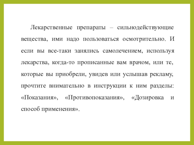 Слайд 7Лекарственные препараты – сильнодействующие вещества, ими надо пользоваться осмотрительно. И если