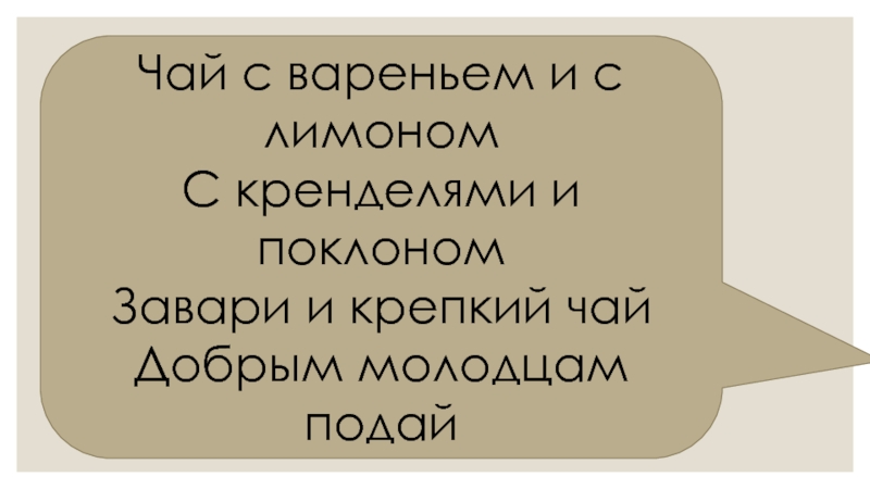 Чай с вареньем и с лимономС кренделями и поклономЗавари и крепкий чайДобрым молодцам подай