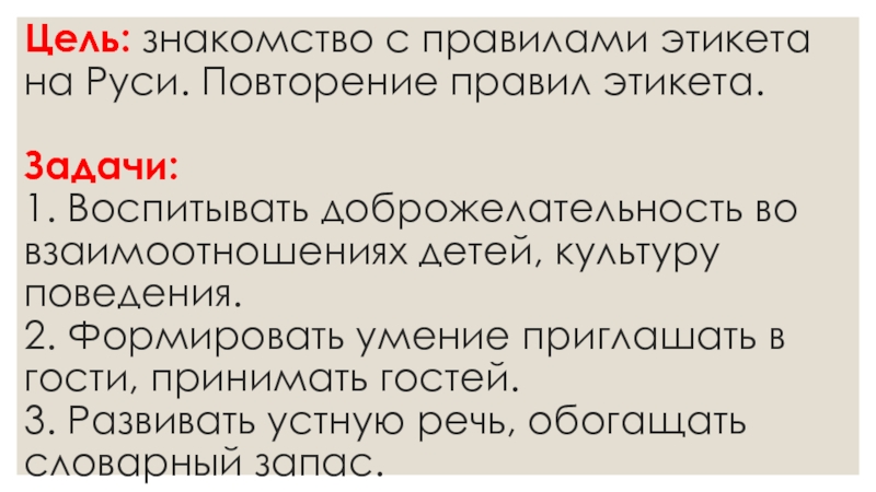 Слайд 2Цель: знакомство с правилами этикета на Руси. Повторение правил этикета. Задачи: 1. Воспитывать