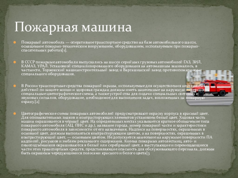 В России транспортные средства пожарной охраны, используемые для осуществления неотложных действий по защите жизни и здоровья граждан должны иметь нанесенные на наружную поверхность специальные цветографические схемы, а также устройства для подачи специальных световых и звуковых сигналов, оборудование, необходимое для выполнения задач, возложенных на пожарную охрану.[2]